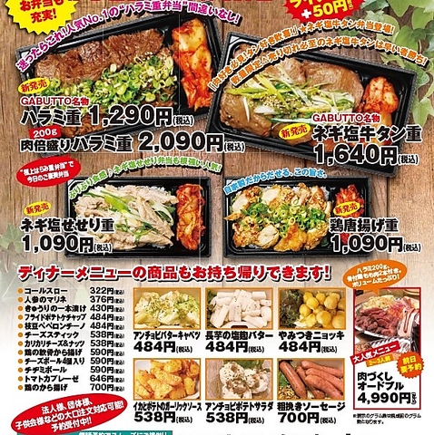 ハラミ重100g1290円(税込)、ネギ塩タン重1640円(税込)、鶏唐揚げ重1090円(税込)、ネギ塩セセリ重1090円(税込)など。他にも単品メニューもたくさんテイクアウトできます!