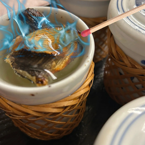 アツアツのひれ酒にマッチをシュッと。アルコールを飛ばす瞬間。暗がりの中で青い炎が立ち昇る一時は、まさに冬の風物詩といえるショータイムです。唯一無二の香ばしさと深い味わい。お客様と共にこの一瞬を愉しむことも、私共の喜びでございます。広めの個室でゆったりと、贅沢な冬の余韻に浸る至福のひとときをお過ごしください。