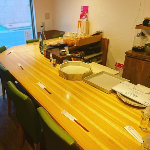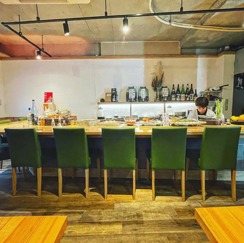 【カウンター席完備】お一人様から少人数様でのご利用におすすめなカウンター席(9席)とテーブル席(6席)をご用意しております。カウンター席は、料理人の技を間近で見ながら、お酒と料理をじっくりと楽しみたい方におすすめです。ライブ感あふれる空間でお過ごし下さい。