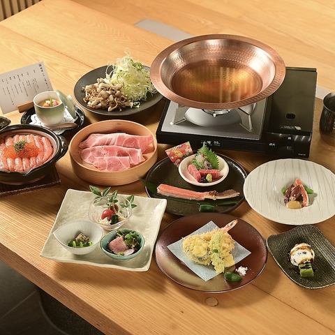 鮮度抜群な北海道産の蟹や、アグー豚しゃぶしゃぶに加え、繊細な技量が光る創作和食もご用意。贅沢なお食事を囲む特別シーンを、是非当店でお過ごしください。