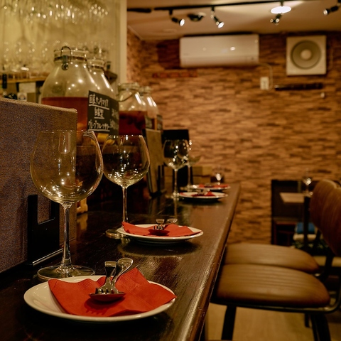 【カウンター席】ワインのコルクが広がるお洒落なカウンター席◆一人飲みにも◎木目のカウンターにレンガ調の壁が目を引く店内女性のお一人様が6割の店舗なので女性1一人様でも安心してご来店頂けます♪