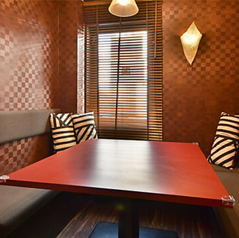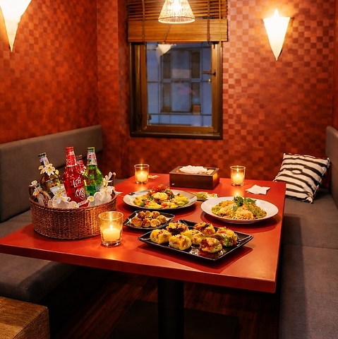 タイを愛するオーナーが現地で直接調達したタイ雑貨がセンス良く飾られ、落ち着いた雰囲気を演出しています。席はゆったりとした4名様~6名様用のテーブル席を完備。友人やご家族とのお食事、各種ご宴会に最適です。飲み放題付きのコースもご用意しており、心ゆくまでタイ料理とお酒をお楽しみいただけます。