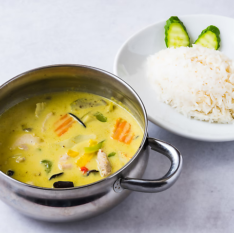 タイのピリ辛のグリーンカレーとジャスミンライスのセットです。