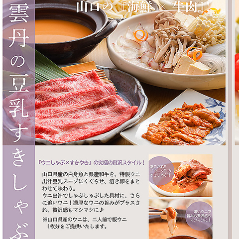 一週間前迄要予約。山口の新ご当地グルメ 登場!ウニスープに割下も入っている、すきやき風のうにしゃぶ。具材には山口県産の魚介はもちろん、山口県産の和牛もついており、贅沢な一品です。