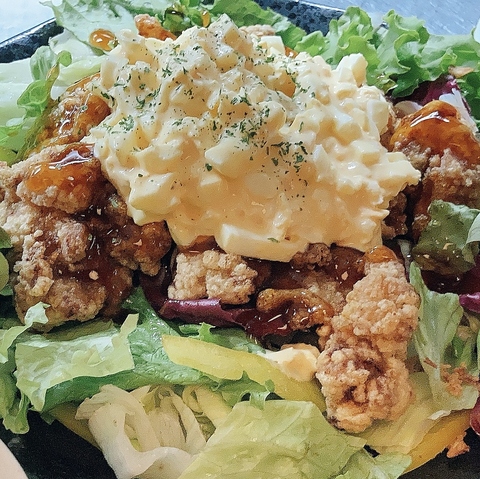当店の大人気メニュー【タルタルソースチキン南蛮】!タマゴをたっぷりと使った手作りのタルタルソースが絶品で、お酒にもご飯にも相性抜群です◎カリカリに揚がったジューシーなチキンと、タマゴの旨みたっぷりなタルタルが絡み合い、口の中で絶妙なハーモニーを奏でます♪ぜひ一度ご賞味いただきたい逸品です!