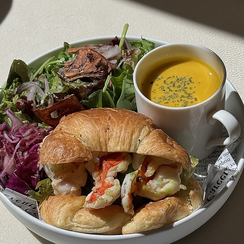 サラダと旬野菜スープ付きで、4種のメインから選べます。クロワッサンサンドオープンサンドクロックマダム自家製キッツシュ