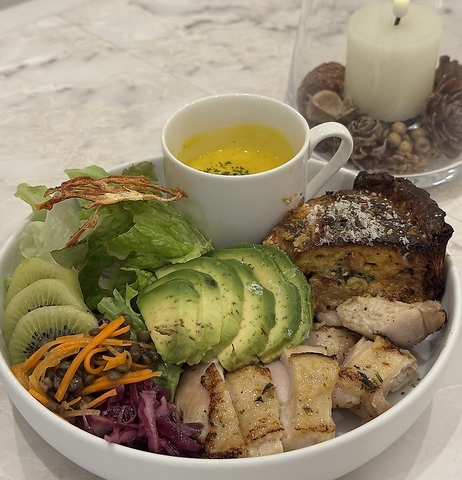彩り豊かなサラダと本日のスープが付いた、バランスのいいランチプレート。見た目も味も満足できる一皿です。