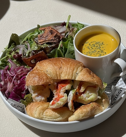 ランチプレートの中でも人気なハーブチキンクロワッサンサンドサラダ・旬の野菜スープ付き。