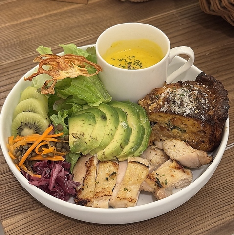 燻製の香り豊かなサーモンと、爽やかな酸味のグリークヨーグルトを合わせたオープンサンド。濃厚さと軽やかさが絶妙に調和し3種のナッツがアクセントを添えます。ヘルシーで見た目も鮮やかな、カフェスタイルの一品。サラダ・旬の野菜スープ付き