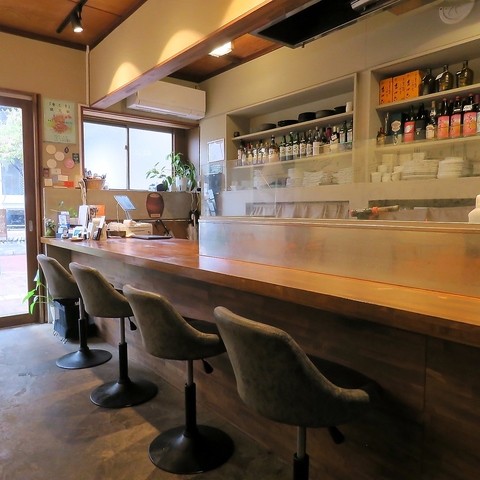 【普段使いができるカウンター席】おひとり様の気軽なお食事や、お仕事帰りのサク飲みなどにぴったりのカウンター席は、5席ご用意しております。スタッフとの会話や調理風景を楽しみながら、のんびり過ごせる特等席◎木のぬくもりが感じられるテーブルと温かみのある照明がリラックスできる雰囲気を演出しています♪