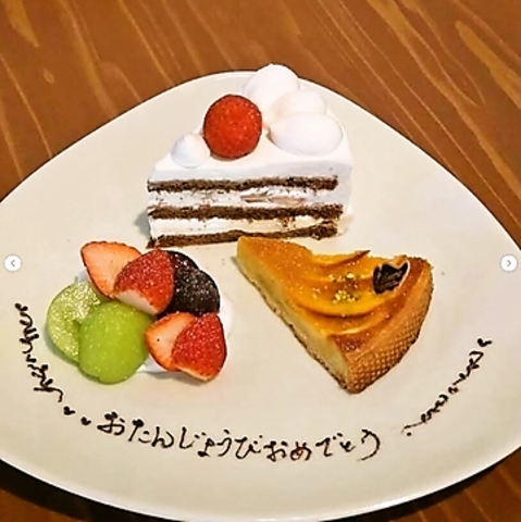 色々な種類のスイーツを季節ごとにご用意しておりますので、新作のスイーツに乞うご期待ください。また誕生日のお祝いにはプレートを提供してますので、ママ友・お子様・ご家族の方などに喜ばれること間違いなしです◎店内でもお祝い事などのデザート盛り合わせを行っており、前日までのご予約で承ります。お電話でのご予約お待ちしています!
