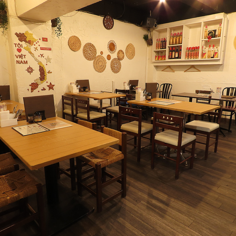 異国情緒ただよう落ち着いた店内で、本格ベトナム料理と豊富なお酒を楽しめます。少人数の飲み会からグループ宴会、貸切利用まで幅広く対応可能◎アジア料理に合うビールや焼酎も充実しており、居酒屋感覚で気軽にご利用いただけます。会社帰りや女子会にもぴったりの空間です。