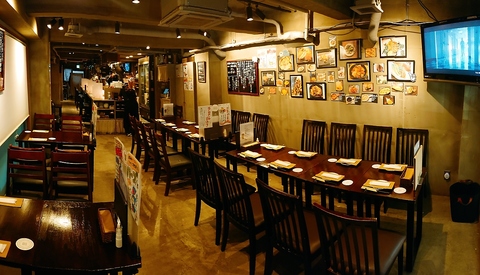 ゆったりと2名様からご利用頂ける4名様仕様テーブルや6名様でもご利用可能な広々テーブルも。宴会時は、18名様まで一列でご利用いただけます。ホールは最大28名様まで収容可能。*貸切のご相談も承っております。