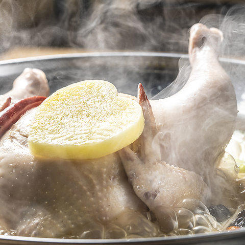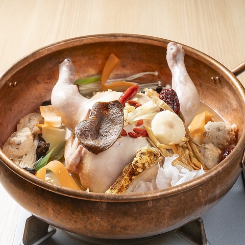 8つの漢方が入ったプレミアムなタッカンマリ。 ビタミンCをはじめ、B1、B2、アミノ酸など多くの抗酸化物質が含まれており、疲労回復、美肌効果、夏バテに効果的です◎専任スタッフがお客様の目の前で丸鶏を切り分け、お客様ご自身が調合するオリジナルの付けダレでお召し上がり頂けます♪