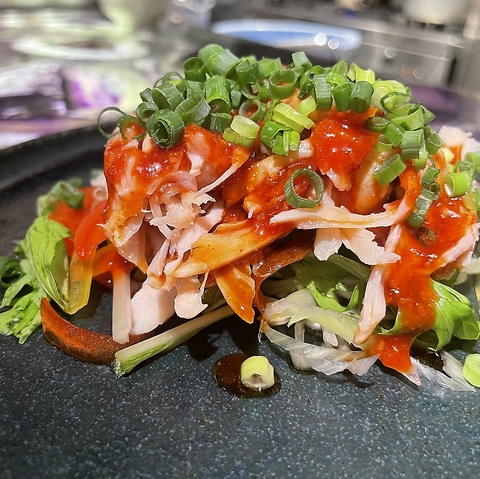 韓国料理といえば!人気の韓国料理「サムギョプサル」もご提供♪豚肉の脂身と赤身のバランスが絶妙で、カリッとジューシーな食感がクセになること間違いなし!サンチュ、えごま、ささネギ、キムチ、青唐辛子、サムジャン付き◎焼き上げた肉を数種類の味を加えサンチュで巻いてお召し上がりください♪