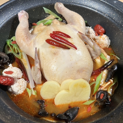 当店の店名でもある名物タッカンマリ鍋☆お鍋でグツグツ鶏をまるっと一羽、韓国で人気の豪快な鍋料理です◎当店だけの進化したタッカンマリは味玉で味変!鍋のスープのスタートは「塩玉」!!「追いスープ」と同時に "味変" を「赤玉」、「味噌玉」、「黒胡麻玉」、「青海苔玉」の5種類をご用意◎〆は親子丼 または うどん付きです♪※2人前~