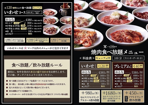 大満足の120種食べ放題の「いわせコース」は、大人4818円(税込)/シニア4268円(税込)/小学生4-6年生2409円(税込)/小学生1-3年生1859円(税込)/幼児550円(税込)/3歳以下無料にてご提供!追加料金で飲み放題もお選びいただけます♪口の中でとろける肉質を心ゆくまでご堪能ください。