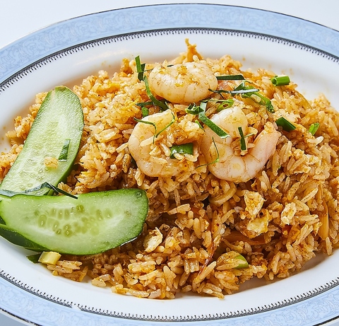 海老とご飯を、卵、玉ねぎ、トマトなどの野菜と共に、ナンプラーやシーズニングソースなどの調味料で強火で炒め合わせた料理です。豚肉入り炒飯と同様に、タイ米のパラパラとした食感と、調味料の旨み、そして具材のバランスが絶妙な、飽きのこない美味しさが特徴です。海老の旨みが加わることで、、シーフードならではの豊かな風味が楽しめます。