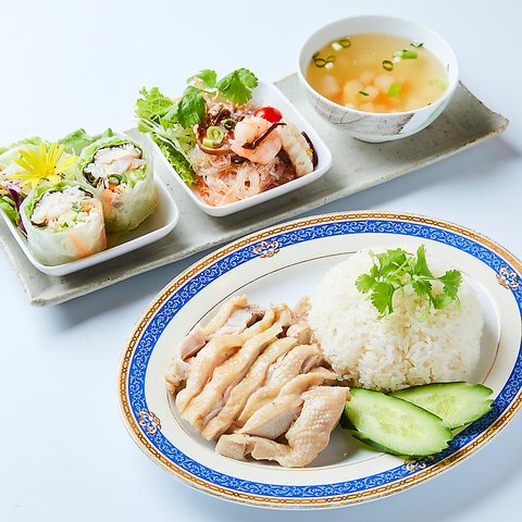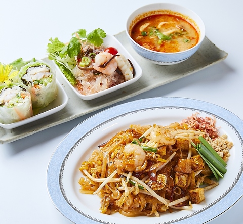 前菜3点盛り合わせ (メニュー内容週替わり)1生春巻き2パパイヤスパイシーサラダ3唐揚げ メーン料理一品選びます1 定番メニューガパオライス2 人気 カオマンガイ3 パッタイ4 トムヤムクンヌードル ソフトドリンクオレンジジュース、グアバジュース、マンゴージュース、ジャスミン茶 本日デザート
