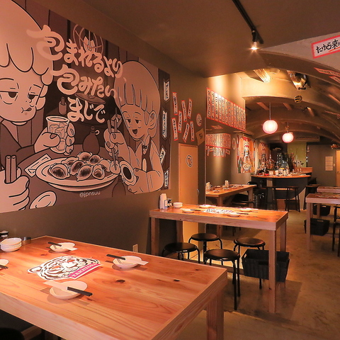 店内は、大きな絵がインパクト大なおしゃれな空間♪博多一口餃子をビールで流し込む姿をおしゃれな絵を背景に写真を1枚★それが"たけとら"スタイル♪餃子の立ち上がる湯気と香ばしい香りが食欲をそそります♪