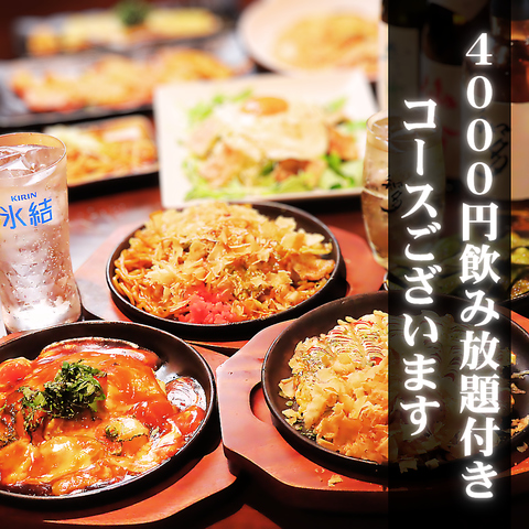 迷ったらこちら!人気の関西お好み焼きや豚肉の焼きそばに加え、山芋とレンコンのチーズチップス、トマトお好み焼きなどお酒が進む絶品メニューをたっぷりご用意しました!嬉しい生ビール付き90分飲み放題で、幹事様も安心の税込4000円です♪自慢の鉄板料理を囲んで、お仲間とワイワイ楽しいひとときをお過ごしください!!