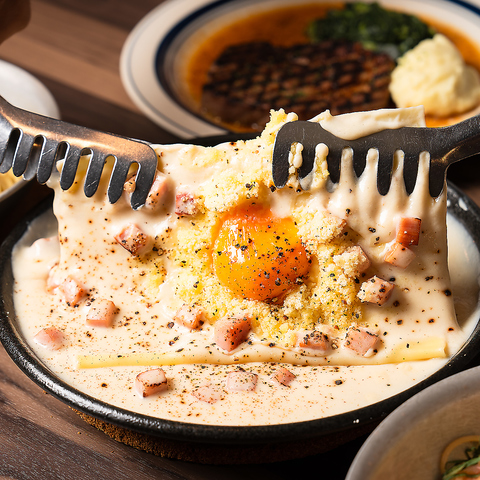 幅広1枚麺のパスタを使用したカルボナーラ。ナイフでカットしてお召し上がりください。
