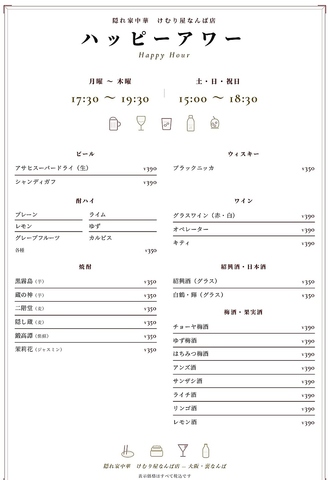 仕事帰りにそのまま直行♪裏なんばの隠れ家中華で、本格ドリンクが、350~390円♪ビール・焼酎・ワイン・紹興酒・梅酒など種類豊富に揃えています。一人でも、同僚と数人でも気軽にどうぞ。月~木 17:30~19:30 土日祝 15:00~18:30※祝前日除く