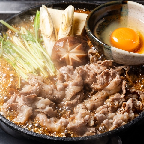 鉄板で焼き上げることで香ばしく仕上げた「鉄板牛すき焼き」もおすすめ!玉子にくぐらせれば絶品♪