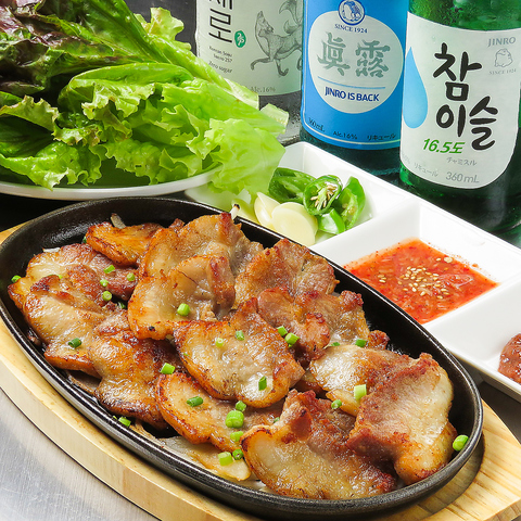 「サムギョプサル、サンチュ、ごま油、きな粉、辛味噌(サムジャン)、ニンニク、青唐辛子」韓国定番料理のサムギョプサル。厳選した豚バラ肉を丁寧に鉄板の上で焼いて提供します。