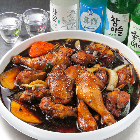 「国産生鶏1羽、春雨、トッポッキトック、ジャガイモ、長ネギ、水キムチ」安東本場の甘しょっぱいタレで仕上げた絶妙な味の安東チムタク。お酒もご飯も進む一品料理です。*辛さの調節承ります。