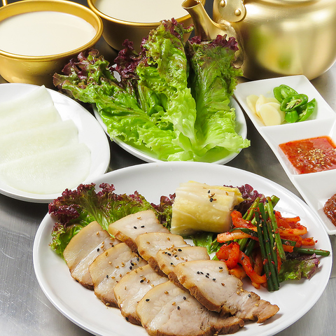「豚バラ肉、サンチュ、白キムチ、大根キムチ、エビの塩辛、辛味噌(サムジャン)、ニンニク、青唐辛子、水キムチ」特性タレに煮込んだ豚バラ肉を様々な総菜とサンチュに巻いて召し上がってください!ウォーマーの上に盛りつけて提供しますので、最後の1点まで暖かくお召し上がりいただけます。