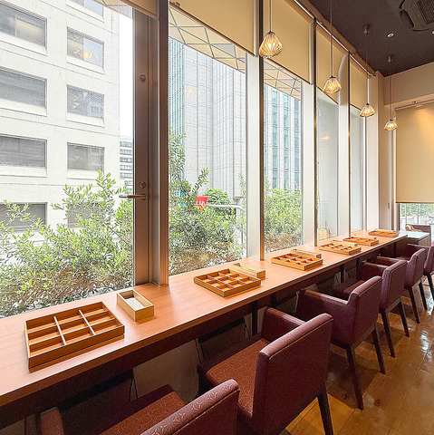 カウンター席も完備。おひとりさまでも利用できるカウンター席。ビジネス街からも近いので平日のランチタイムに訪れるのも◎。色鮮やかな小鉢はごほうびランチにぴったり。陽の光に包まれた店内でリラックスタイムを過ごして。