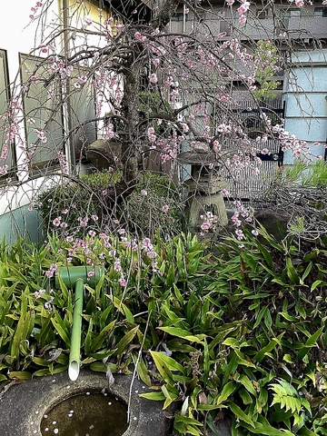 枝垂れ梅近況=つくばいにハラリ(02.23現在)