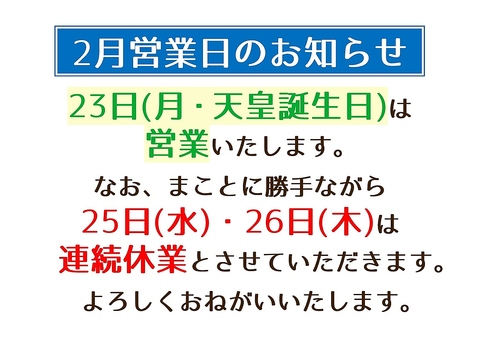 2月のイレギュラー営業にご注意ください
