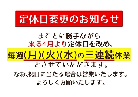 4月以降定休日変更の予告 なお、3月いっぱいは従来通り 基本定休日は(月)(木)のままです