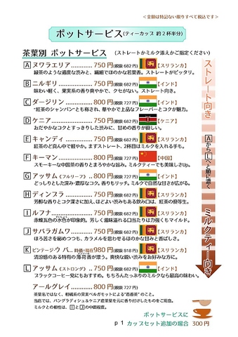 質の高い茶葉を手頃なお値段でご提供します。 / ポットサービスは、茶葉、抽出時間、ストレートかミルクかなど、とりどりの味わいをお試しになっては? / チャイは、紅茶本来のしっかりとしたうまみと、濃厚ミルクと相まって生み出されるあまみを、たっぷりのマグカップでご堪能ください。 / ムジカ(MUSICA TEA)さんの茶葉も販売。