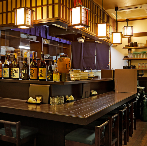 カウンタ―で味わう落ち着く空間。仕事終わりのサラリーマンにぴったり、うまい地酒と海鮮類でほっと一息つけるサク飲み体験を。