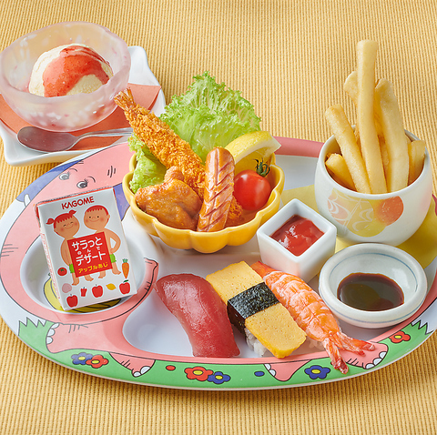 直径30cmの大名椀にお子様の大好きなおかずがぎっしり!牛すき鍋と寿司も付いた主役だらけの一品。年齢の目安:9才~