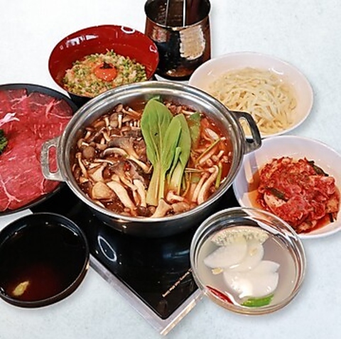 当店の定番になる韓国風の牛肉しゃぶしゃぶ定食です。サッと出汁にくぐらせ、お好みに合わせてタレをつけてお召し上がりください。セットとして、“牛肉+野菜+カルグクス+キムチ” が出ます。