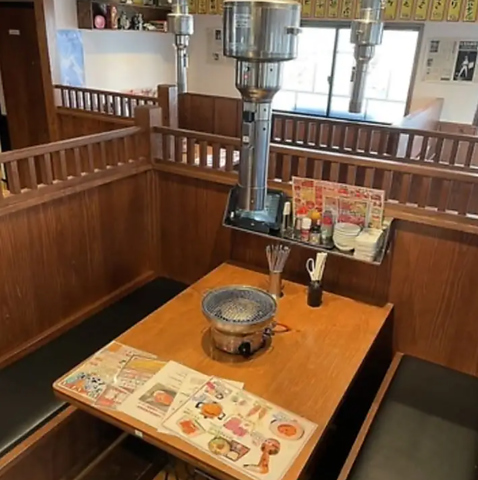 ゆったりと座れるベンチシートが特徴のテーブル席は、長時間の食事や宴会利用でも疲れにくく、リラックスして過ごすことができます。頭上には排気ダクトが設置され、焼肉特有の煙や匂いをしっかり吸引。壁一面に貼られたメニュー短冊やポップが、活気ある焼肉店ならではの雰囲気を高め、食欲を一層引き立ててくれます。
