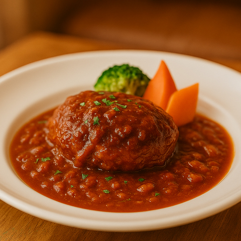 「禁断の味。一口で魂を奪われる。 ハンバーグ ステーキ特製ソース。野菜の甘味、白ワインビネガーの酸味、トマトソースの旨味。スパイスが誘惑し、粒マスタードとバターが絡みつく。 抗えない、悪魔の囁き。「一口で魂を奪われる、禁断の味。」 あなたは、この誘惑に抗えるか?