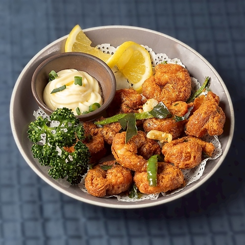 チェンナイ風のスパイシーなプリプリエビ。カラッと揚がった海老にお好みでレモンを搾ったり、マヨネーズをディップしてお召し上がりください。お酒がすすむこと間違いなし♪