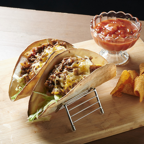 香ばしく焼いたトルティーヤに、ジューシーな具材と自家製ソースをたっぷり包んだ本格タコス!カフェタイムのお供にも、夜はお酒と一緒にも相性抜群。気軽につまめる一皿です♪