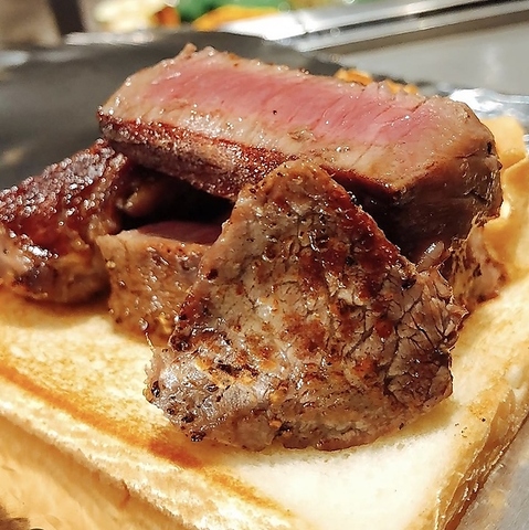 人気黒毛和牛なにわ黒牛のヒレ。トーストの上にのせてのご提供です。肉汁を吸ったトーストとご一緒に♪