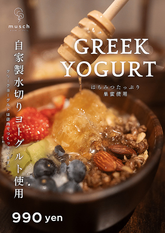 店内で丁寧に手作りしているグリークヨーグルトは、自家製だからこその濃厚でなめらかな口あたりが自慢です。さらに、とろーり甘いはちみつと、見た目も華やかな巣蜜を贅沢にトッピング◎上品な味わいをぜひご堪能ください。