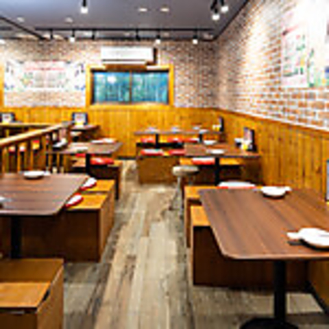 店内は木目調の壁とレンガ風の装飾が特徴で、どこか温かみのある落ち着いた空間が広がります。ナチュラルな色合いで統一された内装は、誰でもリラックスしやすく、会話のしやすい心地よさが魅力。照明も柔らかく、焼肉の香ばしい香りとともに食欲をそそる雰囲気を演出しています。日常の食事や気軽な飲み会にもぴったりの空間です。