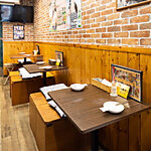 1階にはデートや少人数での食事にぴったりの落ち着いた空間が広がります。木目調の内装とレンガ壁が温かみを演出し、カジュアルながらも清潔感があり、初めての方でも入りやすい雰囲気。ゆったりとした座席配置で、会話も弾む居心地のよさが魅力です。