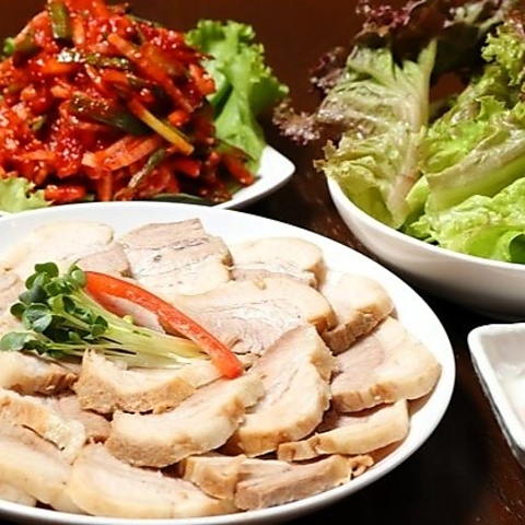 厚切りにカットされた豚の三枚肉を鉄板でじっくり焼き、外はカリッと、中はジューシーに仕上がるサムギョプサルは、看板メニューとして人気の一皿。特製の味噌ダレや塩、ごま油を付けて、サンチュやネギと一緒に包めば旨み倍増。香ばしい肉の香りとともに食欲を刺激し、ビールとの相性も抜群です。