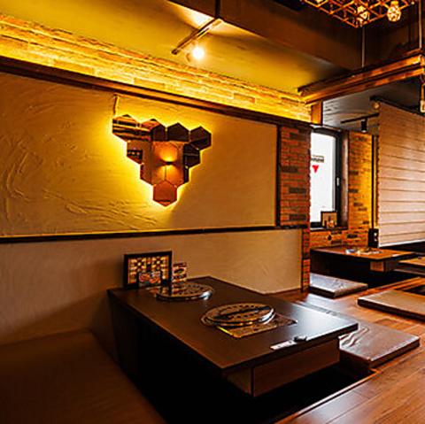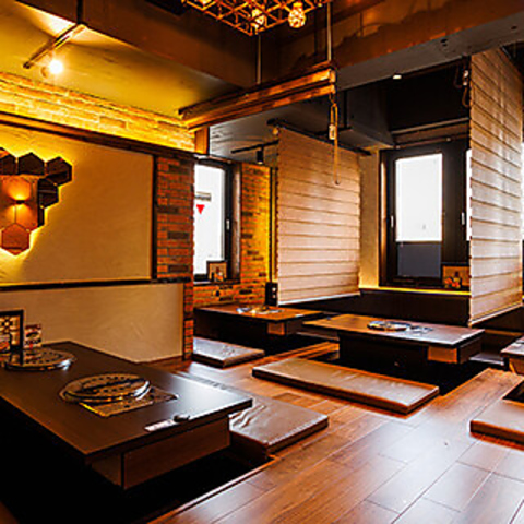 お洒落な店内で、ゆったり寛げる掘りごたつ席をご用意。足を伸ばしてリラックスしながら、厳選ホルモン、韓国料理、焼肉を堪能できます。 ナイスな空間で、会話も食事も飲食もGOOOOD!!女子会やデートにもおすすめです