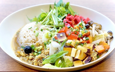 鶏ひき肉たっぷり、お野菜(8から10種類)をかき混ぜて召し上がってください
